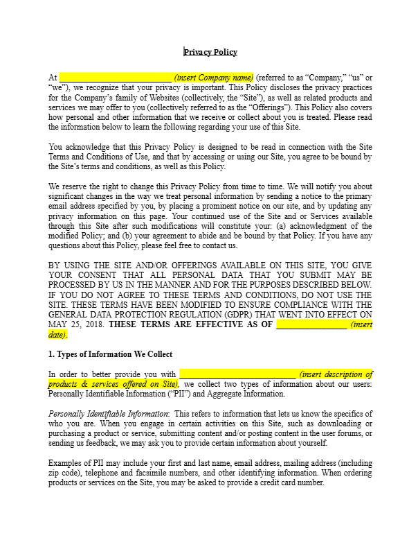 This privacy policy template includes key terms, such as: